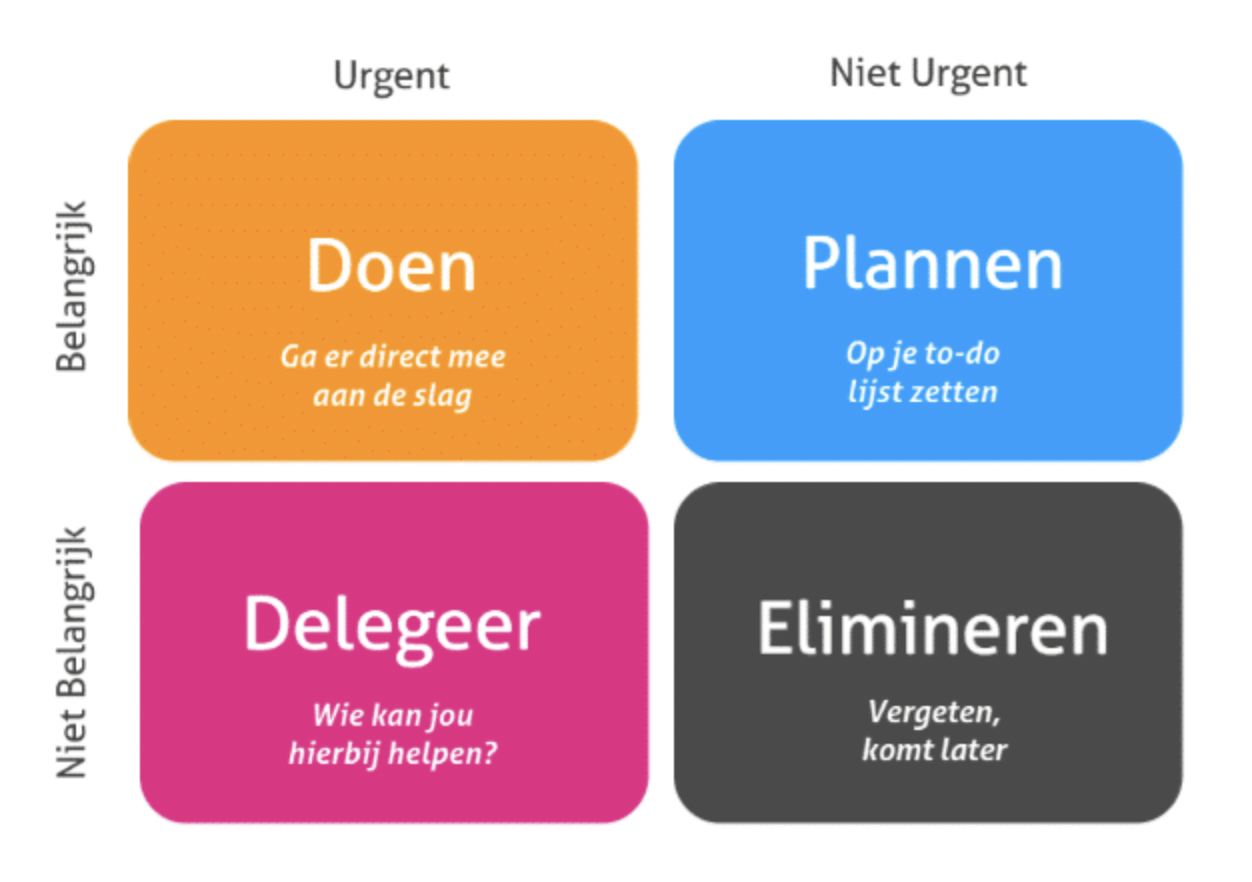 Inventariseer aan het begin van de dag alle taken en maak hier een lijstje van. Start met de taak die prioriteit heeft. 's Ochtends ben je namelijk vaak nog het scherpst! Vind je het moeilijk om te bepalen welke taken belangrijk zijn en welke urgent? Dan kan de Eisenhower Matrix (zie hieronder) je hierbij helpen.